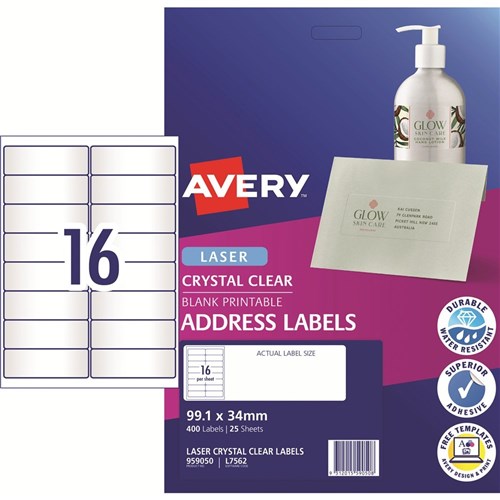 Avery Crystal Clear Laser Address Labels White L7562 99.1x34mm 16UP 400 Labels