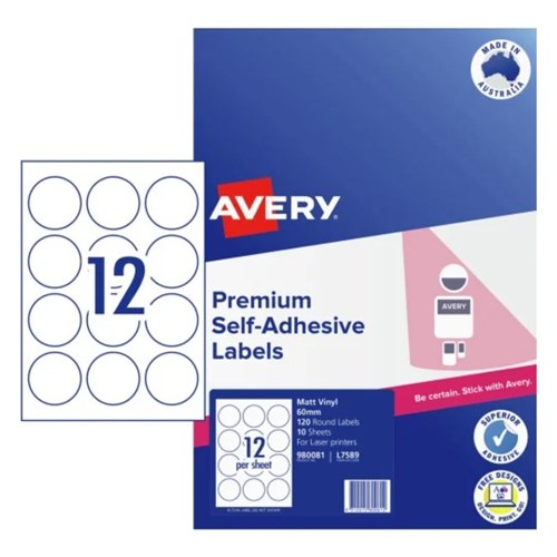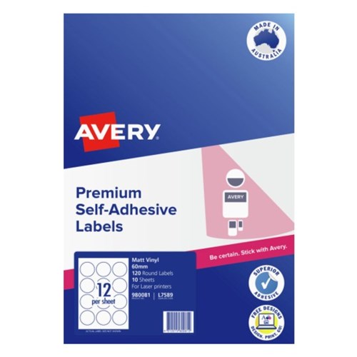 Avery Durable Blank Printable Labels L7589 60mm Round Matte White 12UP 120 Labels
