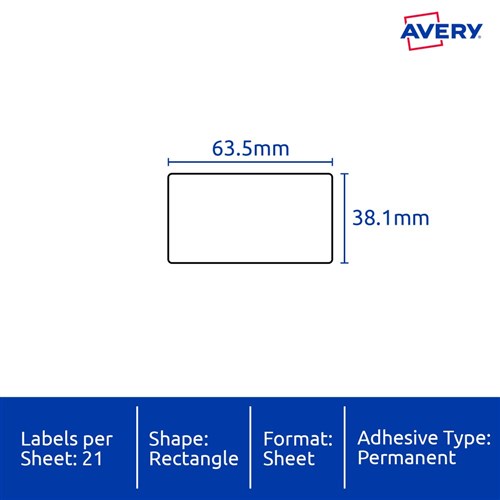 • Size: 63.5x38.1mm 525 labels, 25 sheets. 21 labels per sheet (21UP).