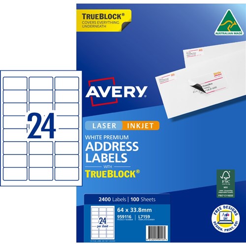 Avery Trueblock Address Labels Laser L7159 64 x 33.8mm 24UP 2400 Labels