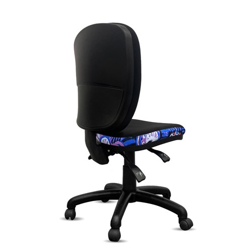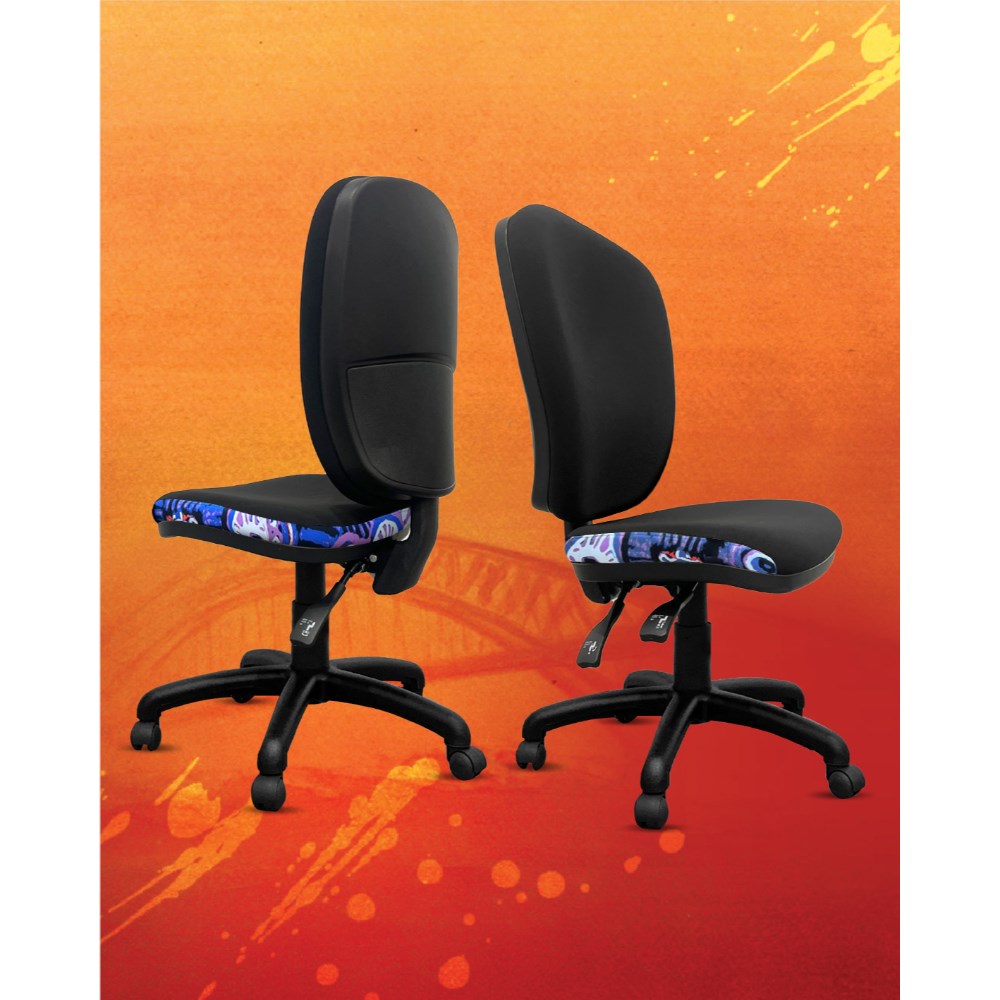 • A unique commercial fabrics designed by Murdie Nampijinpa Morris (Indigenous Artist) combined with K2 Black Fabric to upholster the chair.