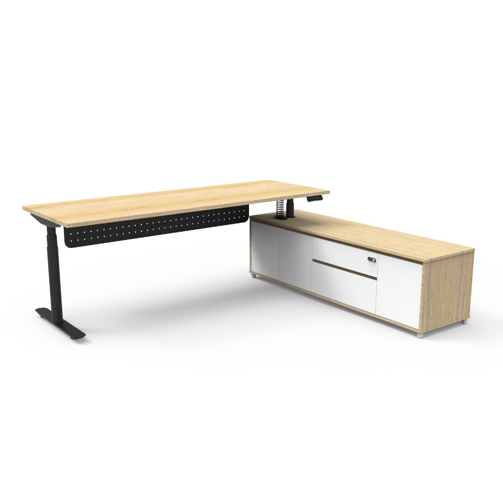 Rapidline Halo+ Executive Desk + RHS Cabinet + Panel 2270W x 1936D x 620-1270mmH Oak/Black