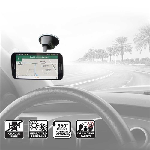 • StickGrip material on suction cup mount base plus automotive-grade adhesive mounting disk provides a strong, secure hold on dashboards, windows, countertops, desks, tables and other surfaces.