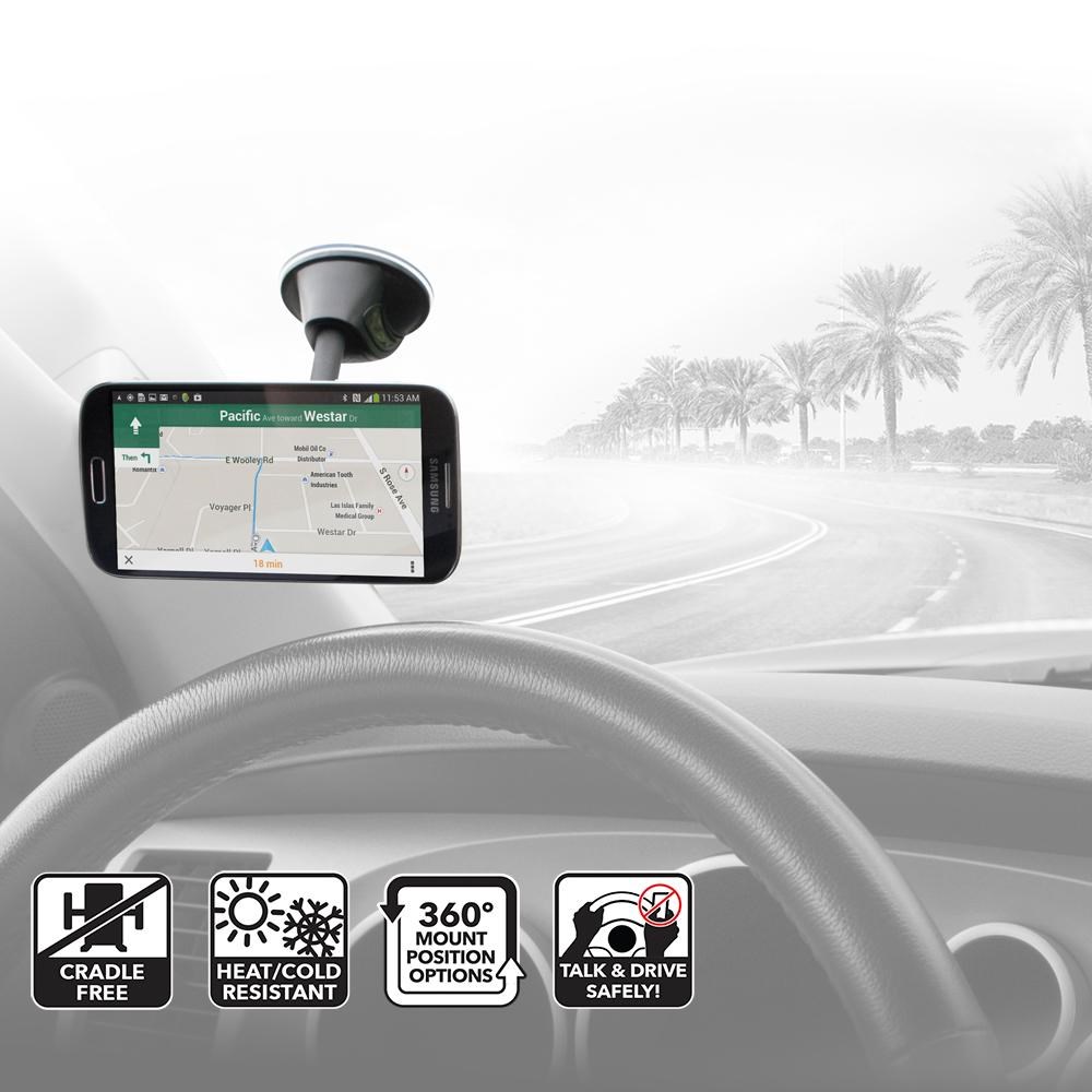 • Suction cup attaches securely to dashboard or window surfaces.