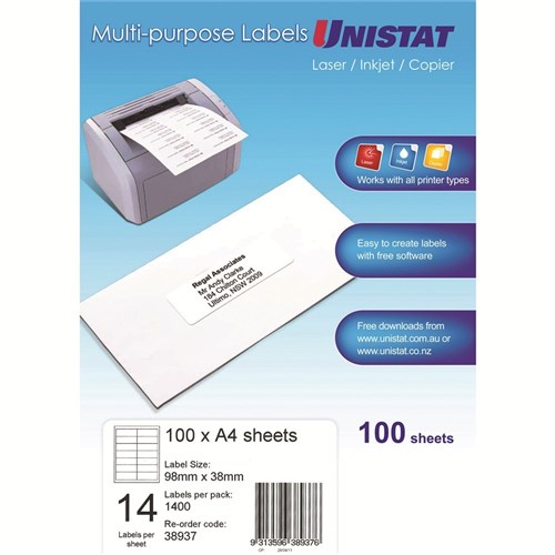 Unistat Laser Copier & Inkjet Labels 98x38mm 14UP 1400 Labels 100 Sheets
