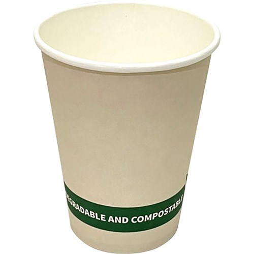 • 12oz (355mls) capacity, single-walled cups with a polylactic (PLA) bio-lining and 89mm diameter.