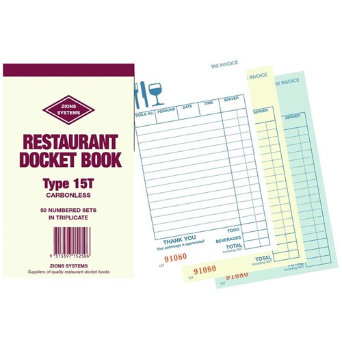 • Zions offers a wide range of single, duplicate, triplicate and quadruplicate restaurant docket books, suitable for all styles of bistros, cafes, restaurants and take-away outlets.